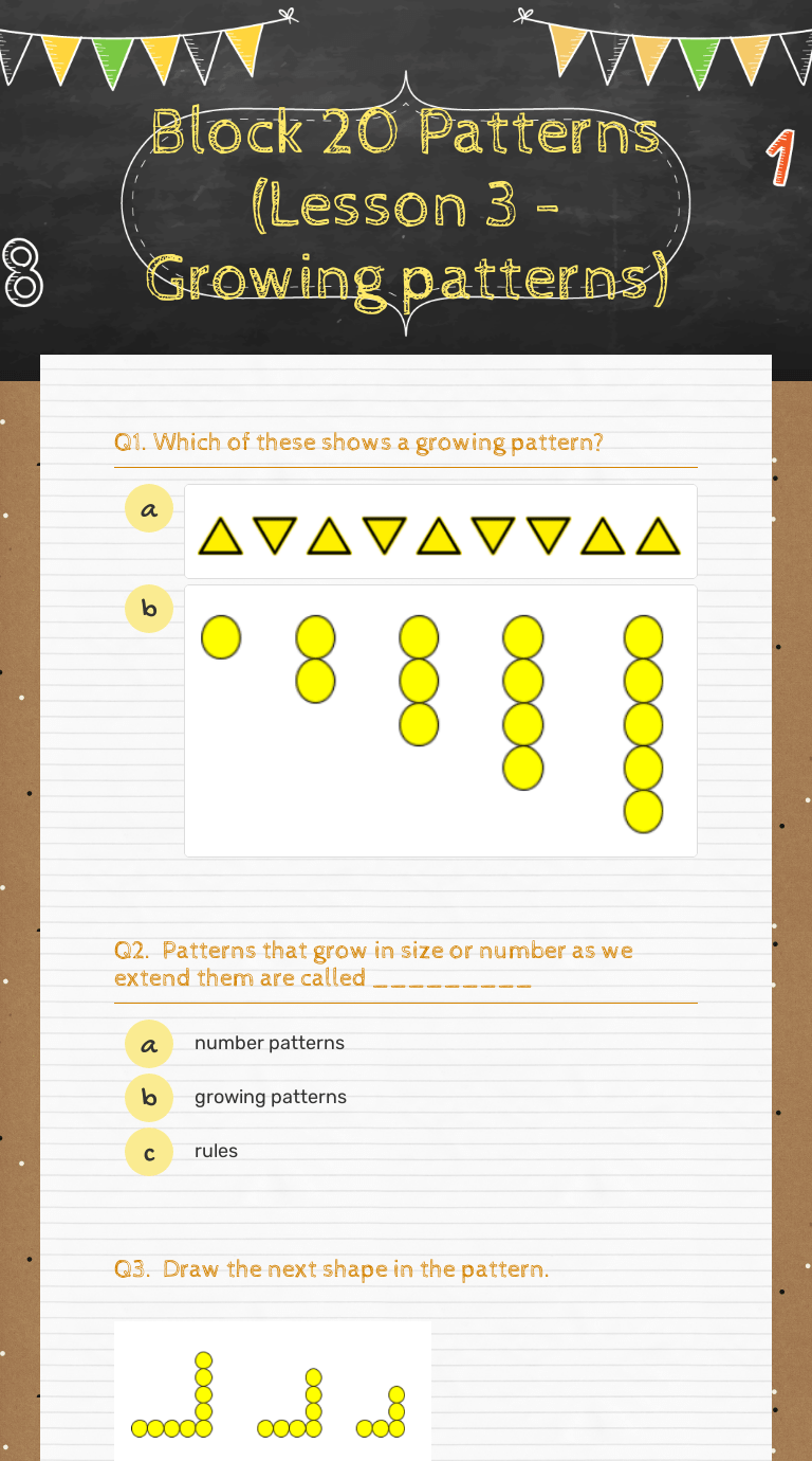 Browse growing patterns worksheet resources on teachers pay teachers, a marketplace trusted by millions of teachers for original . In this worksheet, we will practice how to recognize growing patterns of shapes and find the missing shape in a growing pattern. Distribute the growing pattern activity sheet to students. The number pattern worksheets feature numbers with a pattern. Another type of pattern is the growing pattern.